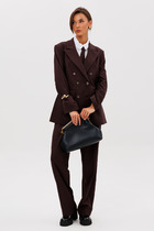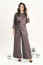Классический брючный комплект из костюмной ткани на подкладке. Жакет приталенного силуэта с прорезными карманами с клапанами по переду. Воротник-английский, рукава - двухшовные. На лацкане- цветок ручной работы. Застегивается на две пуговицы. Брюки-клеш с началом расширения от колена. Брюки с двумя карманами округлой формы и поясом-обтачкой. Застегиваются на молнию по переду и одну пуговицу.