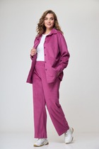 Классический брючный комплект из костюмной ткани на подкладке. Жакет приталенного силуэта с прорезными карманами с клапанами по переду. Воротник-английский, рукава - двухшовные. Брюки-клеш расширены к низу, с началом расширения выше колена 5 см. Брюки с двумя карманами округлой формы и поясом-обтачкой. Застегиваются на молнию по переду и одну пуговицу.
