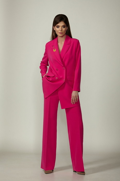 Брючный комплект из костюмной ткани на подкладке. Двубортный жакет выполнен в стиле оверсайз.  Воротник-с отложными лацканами пиджачного типа, рукава – двухшовные. По переду- прорезные карманы с клапанами. Жакет имеет  два ряда пуговиц, застегивается на две основные пуговицы, одну потайную, остальные пуговицы несут декоративный характер. Изюминка комплекта- декоративная булавка лимонного цвета.  Брюки прямые со складкой, широким поясом-обтачкой, наклонными карманами. Застегиваются на молнию по переду  и пуговицу.