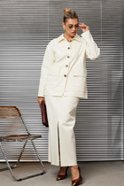 Комплект из костюмной ткани на подкладке, состоящий из жакета и юбки. Жакет приталенного силуэта с прорезными карманами с клапанами по переду. Воротник-английский, рукава - двухшовные. Застегивается на две пуговицы. Юбка на подкладке, слегка зауженная к низу, с рельефами и поясом. Ширина пояса регулируется резинкой. В среднем шве заднего полотнища юбки - застежка-молния и шлица. Кант цвета серебра по краю борта, клапанам жакета и рельефам юбки.