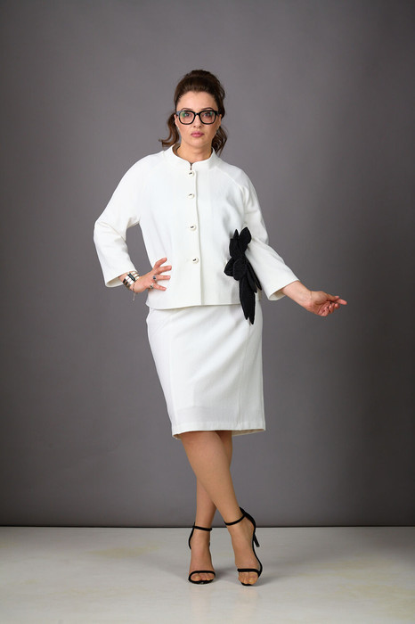 Новинка на весну -комплект на подкладке из стрейчевой ткани с эффектом креша молочного цвета! Только представьте, как изысканно вы будете смотреться в этом стильном изделии! Жакет прямого силуэта с воротником-стойкой и карманами с клапанами. Рукава-реглан, трехчетвертные. Застежка на пуговицы. Юбка прямого силуэта, немного зауженная к низу, с поясом с резинкой. В среднем шве-молния и шлица.