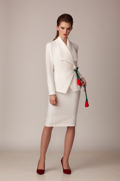 Роскошный комплект из стрейчевой костюмной ткани на подкладке, состоящий из жакета и юбки. Двубортный жакет с рельефами по переду, с завязками из ярких цветов ручной работы, выполненных из атласа, и потайной пуговицей, с помощью которых можно легко регулировать ширину. Воротник - апаш. Рукава - длинные, двухшовные. Юбка на подкладке, с рельефами, слегка зауженная к низу, с поясом. В среднем шве заднего полотнища юбки - застежка-молния и шлица. Длина жакета по спинке 60 см,по переду - 66см, длина рукава 63 см, длина юбки 67 см.