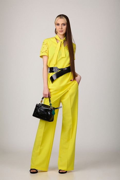 Комплект из плательной ткани, состоящий из блузы и брюк. Блуза асимметрична по длине, с V-образным вырезом горловины и завязкой-галстуком . Рукава – втачные, короткие, выполнены из гипюра. Брюки прямые со складкой, широким поясом-обтачкой, наклонными карманами. Застегиваются на молнию по переду и пуговицу. Комплект можно разнообразить поясами разного цвета. Пояс в комплект не входит.