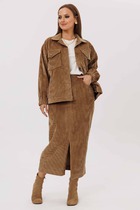 Комплект, состоящий из жакета и юбки, из джинсовой ткани на подкладке. Жакет с расширенной линией плеч, с отрезными бочками по переду и спинке и вытачками по переду. Воротник-с отложными лацканами пиджачного типа. По переду - прорезные карманы с клапанами. Рукава длинные, двухшовные. Жакет застегивается на три пуговицы. Юбка прямая с наклонными карманами и складкой по переду, с широким поясом-обтачкой. Застегиваются на молнию сзади.