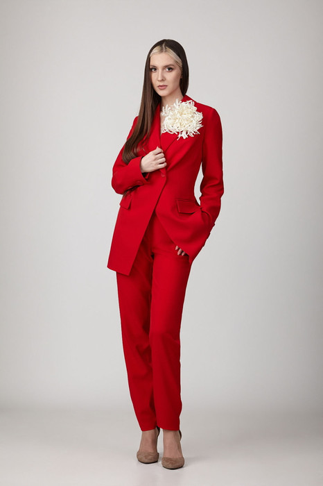 Брючный комплект из костюмной ткани на подкладке. Двубортный жакет полуприталенного силуэта с отрезными бочками и вытачками по переду и спинке. Воротник-с отложными лацканами пиджачного типа. По переду - прорезные  карманы  с клапанами. Рукава длинные, двухшовные. Жакет застегивается на две пуговицы. Жакет декорирован цветами-брошами ручной работы. Брюки узкие, с двумя карманами и поясом-обтачкой.  Застегиваются на молнию по переду и  одну пуговицу.
