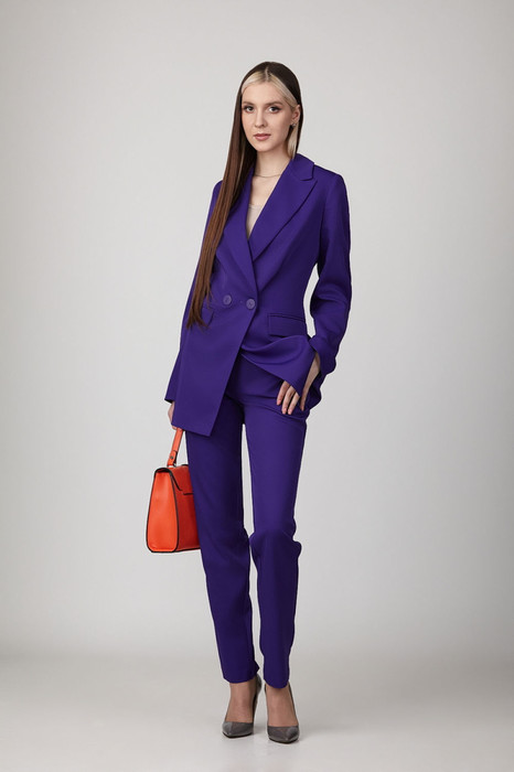 Брючный комплект из костюмной ткани на подкладке. Двубортный жакет полуприталенного силуэта с отрезными бочками и вытачками по переду и спинке. Воротник-с отложными лацканами пиджачного типа. По переду - прорезные  карманы  с клапанами. Рукава длинные, двухшовные. Жакет застегивается на две пуговицы. Брюки узкие, с двумя карманами и поясом-обтачкой.  Застегиваются на молнию по переду и  одну пуговицу.