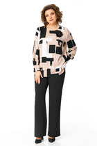 Брючный комплект из костюмной ткани на подкладке. Двубортный жакет полуприталенного силуэта с отрезными бочками и вытачками по переду и спинке. Воротник-с отложными лацканами пиджачного типа. По переду - прорезные карманы с клапанами. Рукава длинные, двухшовные. Жакет застегивается на две пуговицы. Брюки прямые со складкой, широким поясом-обтачкой, наклонными карманами. Застегиваются на молнию по переду и пуговицу.