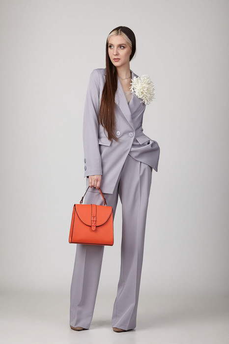 Брючный комплект из костюмной ткани на подкладке. Двубортный жакет полуприталенного силуэта с отрезными бочками и вытачками по переду и спинке. Воротник-с отложными лацканами пиджачного типа. По переду - прорезные  карманы  с клапанами. Рукава длинные, двухшовные. Жакет застегивается на две пуговицы. Жакет декорирован цветами-брошами ручной работы. Брюки прямые со складкой, широким поясом-обтачкой, наклонными карманами. Застегиваются на молнию по переду  и пуговицу.