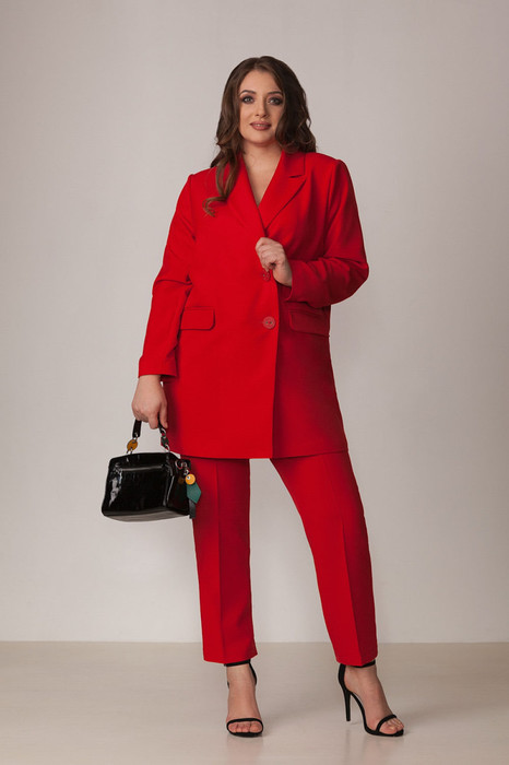 Брючный комплект из костюмной ткани на подкладке. Двубортный жакет выполнен в стиле оверсайз. Воротник-с отложными лацканами пиджачного типа, рукава – двухшовные. По переду-прорезные карманы с клапанами. Жакет застегивается на две основные пуговицы и одну потайную. Брюки слегка заужены к низу, с двумя наклонными карманами и поясом. Застегиваются на молнию по переду и одну пуговицу.