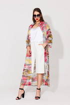 Кардиган прямого силуэта с цельнокроеным рукавом. Воротник отложной с кулисой. Перед оформлен контрастными вставками и накладными карманами с клапаном. Манжета отложная из отделочной ткани с принтом. В боковых швах разрезы.