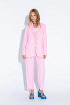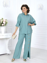 Комплект 3-х предметный, состоящий из жакета, брюк и топа. Жакет и брюки выполнены из качественной костюмной ткани. Жакет однобортный на подкладке. По переду - рельефы, по спинке средний шов. Рукав втачной двушовный. Застежка на 4 петли и 4 декоративные пуговицы.