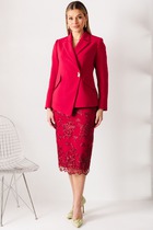 Жакет прямого силуэта без подкладки, с центральной застёжкой на петли и металлические пуговицы. Полочка с нагрудными вытачками и настрачными клапанами в области груди, в области бёдер расположены накладные карманы с клапанами, застёгивающиеся на петлю и пуговицу. Спинка со средним швом. По линии талии расположена кулиса с завязывающимся поясом. Горловина круглая, рукав втачной, короткий.