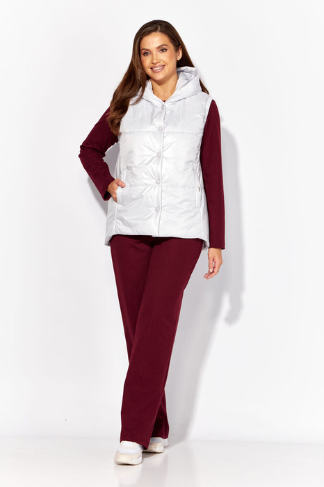 Жилет прямого силуэта, плащевка на синтепоне (VS-100), простеган широкими горизонтальными строчками, на подкладке. По переду рельефы и карманы с "листочкой" Застежка центральная на кнопки. Горловина оформлена капюшоном. На спинке отделочная деталь с нашивкой. Низ жилета сзади удлиннен.