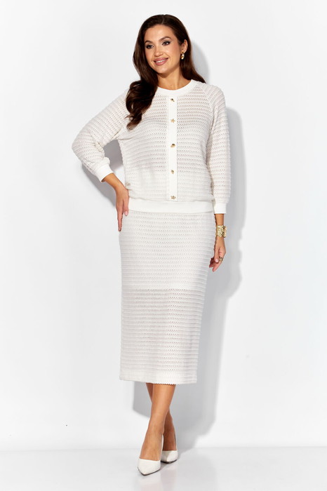 Комплект женский, 2х предметный, состоящий из джемпера и юбки, выполнен из трикотажного полотна (вязка) Джемпер прямого силуэта с рукавом покроя "реглан" длинной 3/4. Низ рукава и джемпера на манжете. Горловина круглой формы, с подрезной бейкой. По центру переда отлетная планка (имитация застежки) с отделочными пуговицами. Юбка прямая, на трикотажной подкладке. Пояс цельнокройный, на резинке по кругу. Фурнитура на изделии может отличаться от фотографии.
