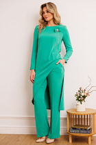 Брюки прямые, с карманами. Спереди рельефы с отделочными строчками. Пояс притачной, частично на резинке.