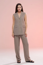 Брюки прямые, на притачном поясе с резинкой. На передних половинках есть функциональные карманы. На задних половинках обработана кокетка. Брюки, как и жакет, выполнены из лёгкой стрейчевой ткани.