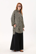 Джемпер свободного кроя выполнен из мягкого, приятного к телу трикотажа , с разрезами и удлинённой спинкой. На переде обработаны нагрудные вытачки. Рукав длинный, втачной. Брюки прямые, выполнены из стрейчевого джинса и экокожи. На передних половинках брюк обработаны внутренние карманы и поперечные швы над уровнем колена, на задних половинках кокетки. Притачной пояс брюк с пуговицей и с резинками в районе боковых швов.