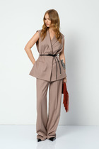 Брюки прямые, на притачном поясе с пуговицей и с резинками в районе боковых швов. На передних половинках обработаны функциональные карманы.