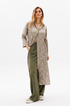 Туника свободного кроя, со спущенной линией плеча. Перед ассиметричный, двухслойный, с нагрудными вытачками и отделочным элементом(съёмный бант). Спинка со средним швом. В боковых швах обработаны разрезы. Рукава втачные, с разрезами, декорированные пришивными украшениями, по низу обработаны манжетами. Горловина округлой формы, так же декорирована пришивными стразами.