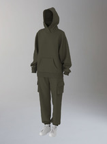 Костюм женский из гладкокрашеного трикотажного полотна футер-двунитка, состоящий из футболки и брюк. Футболка – классического покроя, с короткими втачными рукавами и горловиной овальной формы, обработанной втачной планкой. В нижней части полочки слева настрочен декоративный элемент прямоугольной формы.Брюки – длиной 7/8, слегка зауженные книзу, на притачном поясе с эластичной тесьмой внутри и карманами в боковых швах. Передние половины брюк застрочены по линиям центра вдоль на 0,3 см.