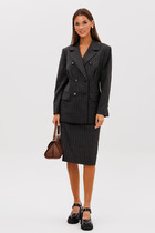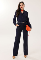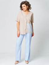 Комплект из двух предметов: блуза и брюки. Блуза женская жакетного типа, полуприлегающего силуэта, выполнена из струящейся поливискозы. Блуза с центральной застёжкой на петли и пуговицы. Горловина оформлена воротником пиджачного типа. Правая деталь переда блузы с нагрудной выточкой, левая - с вертикальным рельефом и подрезом, в области груди обработана декоративная листочка. Спинка цельнокроенная с талиевыми выточками. Рукав втачной длинный, низ рукава обработан притачной манжетой, которая застёгивается на 2 петли и пуговицы. Брюки классической формы, прямого силуэта, со стрелками по передним и задним половинкам. Верхний срез обработан обтачным поясом, дополнен практичными шлевками для ремня. На задних половинках расположены талиевые вытачки с настрочными декоративными листочками. В боковых швах брюк обработаны наклонные карманы. Застёжка центральная на тесьму-молнию и крючок. Брюки комплектуются ремнем.
