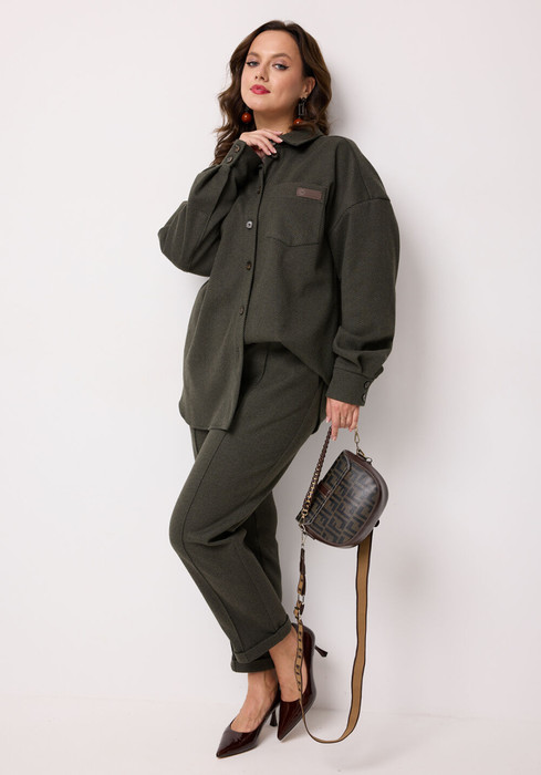 Комплект женский 2-х предметный, состоящий из блузы и брюк. Блуза выполнена из поливискозы с принтом "елочка". Блуза длиной до середины бедра, прямого силуэта, с центральной застёжкой на петли и пуговицы. Горловина рубашечного типа. Блуза со спущенной линией плеч. Рукава длинные, по низу обработана шлица и притачные манжеты, которые застёгиваются на 2 петли и пуговицы. На одной манжете настрочена декоративная нашивка. В области груди, с одной стороны, накладной карман с декоративной нашивкой. Спинка с кокеткой и со средним швом, в котором обработана шлица, застегивающаяся на 3 петли и пуговицы. Низ блузы закруглен. Брюки выполнены из полизивкозы однотонного компаньона. Брюки прямого силуэта, слегка заужены к низу. Низ брюк с цельнокроеной манжетой. Брюки с отстроченными по переду стрелками и заутюженными по задним половинкам. Верхний срез обработан притачным поясом, в который вставлена резинка. По центру переда - застёжка-обманка. В боковых швах расположены наклонные карманы.