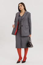 Костюм состоит из жакета и брюк. Качественная поливискоза, из которой выполнена модель, обеспечит долговечность изделию и приятные ощущения его обладательнице. Жакет без подкладки прямого силуэта, с двубортной застежкой на петли-пуговицы, длиной до середины бедра. Перед жакета с нагрудными вытачками, в области груди расположена декоративная листочка. Спинка с двойной кокеткой, в шве притачивания которой обработана встречная складка. Низ жакета фигурный, с закруглениями по боковым швам. Рукава двушовные, длиной  3/4, по низу с манжетой, застегивающейся на петлю и пуговицу. Горловина оформлена воротником пиджачного типа.  Брюки классической формы, прямые от линии бедер, со стрелками по передним и задним половинкам. Верхний срез обработан поясом, в который от бокового шва вставлена резинка по задним половинкам. В боковых швах обработаны наклонные карманы. На задних половинках расположены талиевые вытачки. В комплект входит пояс из основной ткани.