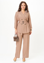 Костюм состоит из жакета и брюк. Жакет без подкладки прямого силуэта, с двубортной застежкой на петли-пуговицы, длиной до середины бедра. Перед жакета с нагрудными вытачками, в области груди расположена декоративная листочка и нашивка. Спинка с двойной кокеткой, в шве притачивания которой обработана встречная складка. Низ жакета фигурный, с закруглениями по боковым швам. Рукава двушовные, длиной  3/4, по низу с манжетой, застегивающейся на петлю и пуговицу. Горловина оформлена воротником пиджачного типа.  Брюки классической формы, прямые от линии бедер, со стрелками по передним и задним половинкам. Верхний срез обработан поясом, в который от бокового шва вставлена резинка по задним половинкам. В боковых швах обработаны наклонные карманы. На задних половинках расположены талиевые вытачки. В комплект входит пояс из основной ткани с декоративной пряжкой.