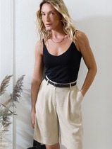 Костюм женский рубашка и шорты. Рубашка женская свободного силуэта. Спущенная линия плеча. Рукав короткий. Длина изделия выше середины бедра. Центральная застежка на 5 клёпок. Стоячеотложной воротник пиджачного типа с закруглёнными углами. На полочке нагрудный настрочной карман. Внешний срез кармана, край воротника, фигурная линия низа обработаны при помощи декоративного канта. Шорты среднего объёма с притачным поясом и манжетом. Карманы "хулиган". Срез притачивания манжета с декоративным кантом.