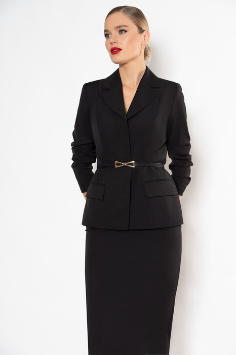 Костюм женский двухпредметный, состоит из жакета и юбки. Костюм предназначен для повседневной носки, всесезонный. В комплект к костюму идет съемный ремень с декоративной пряжкой (цвет и размер фурнитуры может незначительно отличаться от фото).