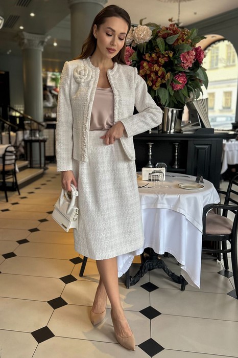 Твидовый костюм выполнен из мягкого и приятного на ощупь твида, который прекрасно держит форму. Белый цвет придаёт костюму свежесть и лёгкость, а съёмный цветок добавляет нотки романтики и изящества, цветок крепится к жакету с помощью специальной застёжки, что позволяет легко менять его в зависимости от настроения или мероприятия.