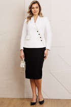 Жакет Длина по среднему шву спинки - 41,0 см (±1,5 см), Ширина спинки - 39,3 см (±0,5 см), Ширина на уровне глубины проймы - 52,0 см (±1,0 см), Ширина по низу изделия - 46,5 см (±1,0 см), Длина рукава - 21,5 см (±1,0 см), Ширина рукава вверху - 18,5 см (±1,0 см), Длина плеча - 10,5 см (±0,5см). Платье Длина по среднему шву спинки - 103,5 см (±2,0 см), Ширина спинки - 36,5 см (±0,5 см), Ширина на уровне глубины проймы - 49,0 см (±1,0 см), Ширина на уровне линии талии - 43,5 см(±1,0 см), Ширина на уровне линии бедер - 54,0 см (±1,0 см), Длина плеча - 7,7 см (±0,5 см), Ширина по низу платья - 67,0 см (±1,0 см).