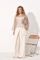 Воротник, лацканы, борта, низ переда и спинки обработан отделочным серебристым кантом. Жакет с плечевыми накладками.