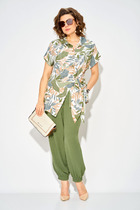 Костюм, состоящий из шорт с прорезными карманами в боковых швах и майки на бретельках с отрезным лифом. На майке с левой стороны внизу расположена печать