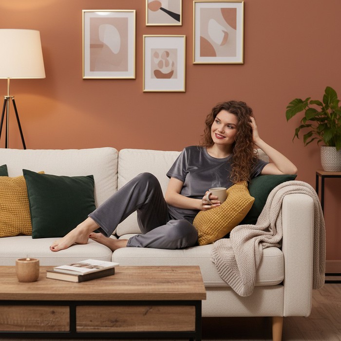 Костюм молодежный из трикотажного полотна «велюр-стрейч», состоящий из футболки и брюк.