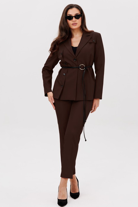 Костюм женский двухпредметный, состоящий из жакета и брюк. Жакет полуприлегающего силуэта, с центральной бортовой застежкой на одну петлю-пуговицу до линии перегиба лацкана. С нагрудной вытачкой, выходящей из бокового шва. На правой части переда обработана отлетная шлица в рельефном шве на 4 петли-пуговицы. Рельеф от плеча и до низа. На левой части переда в верхней части обработан съемный хлястик на 2 петли-пуговицы, имитирующей листочку. Спинка со средним швом. Воротник пиджачного типа. Рукава втачные двухшовные длинные. Жакет на подкладке. Брюки классического кроя, зауженные к низу, с притачным поясом сзади на резинке. Застежка на одну петлю-пуговицу по поясу и тесьму-молнию в средних срезах передних половинок. В изделии обработаны карманы, наклонные к боковому шву. На брюках заютюжены канты.