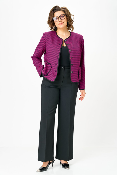 Комплект женский двухпредметный, состоящий из жакета и брюк. Жакет полуприлегающего силуэта с центральной бортовой застежкой на 6 петель-пуговиц. Перед с отрезным бочком, нагрудной вытачкой и накладными карманами фигурной формы. Горловина ии крой борта имеют закругленную форму. Края горловины, борта, низа изделия и рукавов, а также карманы окантованы контрастной киперной тесьмой. Спинка со средним швом. Рукав втачной двухшовный, длинный. Брюки классического кроя, расширенные от бедра, с заутюженными кантами и с притачным поясом сзади на резинке. По краям пояса передних половинок брюк настрочена узкая киперная тесьма. Застежка на тесьму-молнию в передних половинках и петлю-пуговицу по поясу.