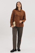 Жакет свободной формы прямого силуэта со спущенной линией плеча. Центральная бортовая застёжка с планкой на петли-пуговицы. По спинке и переду обработана кулиса со втянутой шляпной резинкой и фиксаторами. Функциональные накладные карманы. Воротник стойка. Рукав длинный.