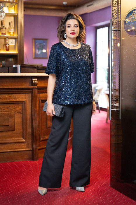 Топ прямого силуэта с естественной линией плеча. По переду выполнены нагрудные вытачки. Горловина округлой формы. В горловине спинке выполнен вырез "капля" с застёжкой на навесную петлю и пуговицу. Верхний слой топа выполнен из полотна с пайетками. Нижний слой топа - из шелка "Double Армани". Рукав длиной до линии локтя.