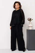 Брюки свободные расширенного силуэта. По бокам выполнены лампасы из полотна с пайетками. Пояс притачной на резинке. В боковых швах карманы.
