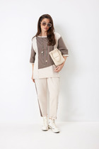 Блуза прямого свободного покроя. Рукав короткий типа "летучая мышь" с отложной манжетой. По переду пробиты увеличенные люверсы. По переду и спинке обработана кулиса с втянутым поясом. Горловина округлой формы, окантована. В боковых швах обработаны разрезы. По переду, снизу, пришита декоративная нашивка авторской формы.