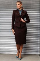 Комплект женский, состоящий из блузки и брюк. Блуза (состав: 61%район, 39%вискоза) выполнена из ткани с тонким шёлковым блеском - мерцает при движении. Блуза свободного силуэта с вырезом горловины в виде «лодочки». Спинка без особенностей. Низ ассиметричный с разрезами в боковых швах от низа. Рукав в блузе втачной на подкладке, в виде буфа, с залаженными декоративными складками по окату и низу. В комплекте идёт пояс из основной ткани. Брюки (состав: 60% полиэстер, 40% полиуретан) прямого силуэта из кожи с рельефами и отстрочкой по переду. По переду застежка на тесьму молнию в гульфике и пуговицу в поясе. По переду брюк наклонные карманы. Пояс притачной со вставкой эластичной тесьмы резинки в «бочках», что обеспечивает комфортную посадку на фигуру. Длина блузы 76,5 см (р 50-54), 77 см (р 56-60), длина рукава 37/45 см. Длина брюк по боковому шву от пояса 98 см.