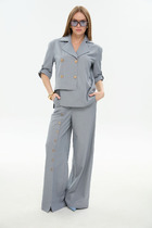 Этот комплект становится не просто одеждой, а настоящим выражением индивидуальности и стиля. Он подходит как для прогулок по городу, путешествий, так и для работы в офисе. Блуза прямого силуэта, с округлой формой горловины. Рукав спущенный, удлиненная линия плеча с притачной манжетой по низу. Спинка без особенностей. По переду блузы- декоративный элемент в виде дизайнерской печати. Юбка прямого силуэта длины «миди» с разрезом спереди. Пояс притачной с эластичной тесьмой-резинкой в бочках, что обеспечивает максимально комфортную посадку на любой тип фигуры, и декоративными шлёвками. Застёжка на тесьму молнию в среднем шве спинки и пуговицу в поясе юбки. По переду юбки функциональные карманы. Низ в юбке с декоративным эффектом «необработанных срезов». Юбка на подкладке. Блестящее напыление, добавляет комплекту особую изюминку. Каждое движение женщины, носящей этот наряд, отражает легкие искорки света, что придаёт комплекту особый шарм. Длина блузы 66 см (р.50-54), 67 (р.56-60). Длина рукава 26,5 см (р.50-54), 29,5 см (р.56-60). Длина юбки без пояса 88 см, ширина пояса 4 см.