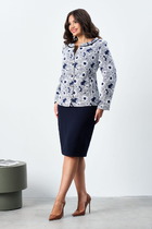 Костюм женский из плотного гладкокрашеного трикотажного полотна "кулирка", состоящий из футболки и шорт. Футболка - свободного покроя, с удлиненными плечевым и швами, короткими втачными рукавами и горловиной овальной формы, обработанной втачной планкой. В нижней части переда слева настрочен декоративный элемент прямоугольной формы. По горловине проложена отделочная строчка. Шорты - классического покроя, на притачном поясе с эластичной тесьмой внутри и карманами в боковых швах. Для регулирования степени прилегания шорт по талии в пояс вставлен шнурок, продетый через два отверстия в соединительных швах в центре пояса.