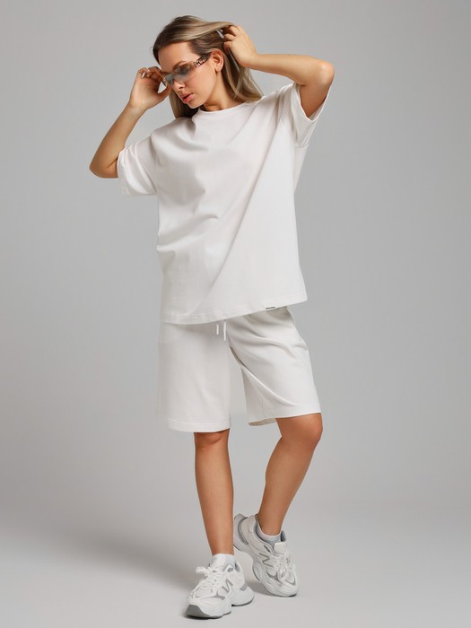 Костюм женский из плотного гладкокрашеного трикотажного полотна "кулирка", состоящий из футболки и шорт. Футболка - свободного покроя, с удлиненными плечевым и швами, короткими втачными рукавами и горловиной овальной формы, обработанной втачной планкой. В нижней части переда слева настрочен декоративный элемент прямоугольной формы. По горловине проложена отделочная строчка. Шорты - классического покроя, на притачном поясе с эластичной тесьмой внутри и карманами в боковых швах. Для регулирования степени прилегания шорт по талии в пояс вставлен шнурок, продетый через два отверстия в соединительных швах в центре пояса.