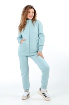 Костюм женский из плотного гладкокрашеного трикотажного полотна "кулирка", состоящий из футболки и шорт. Футболка - свободного покроя, с удлиненными плечевым и швами, короткими втачными рукавами и горловиной овальной формы, обработанной втачной планкой. В нижней части переда слева настрочен декоративный элемент прямоугольной формы. По горловине проложена отделочная строчка. Шорты - классического покроя, на притачном поясе с эластичной тесьмой внутри и карманами в боковых швах. Для регулирования степени прилегания шорт по талии в пояс вставлен шнурок, продетый через два отверстия в соединительных швах в центре пояса.