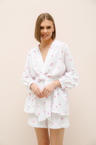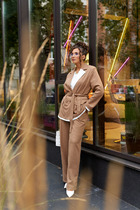 Костюм женский из трикотажного полотна в комбинации двух видов: полотна "кулирка-кармеланж" и полотна "кулирка" с набивным тематическим рисунком, состоящий из футболки и брюк. Футболка - модного силуэта, слегка укороченная свободного покроя, с приспущенным плечом, с втачными рукавами длиной до локтя, горловиной овальной формы, обработанной втачной планкой и принтом в центре переда. По шву втачивания планки настрочена декоративная (5-ниточная) отделочная строчка нитками контрастного цвета Подгибка низа рукавов и изделия так же выполнена с применением декоративной отделочной строчки. Брюки выполнены из полотна с набивным тематическим рисунком, длинные, умеренной ширины, прямые, с эластичной тесьмой по талии.