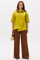 Костюм женский из трикотажного полотна "кулирка" в комбинации двух видов: гладкокрашенного и с рисунком в крупную клетку, сочетающихся между собой по цвету, состоящий из джемпера и брюк. Джемпер - из гладкокрашеного полотна, свободного покроя, с длинными втачными рукавами и приспущенными плечами, с горловиной овальной формы и тематическим принтом, выполненным в технике шелкографии. Горловина, нижние срезы рукавов и низ изделия обработаны подгибкой с отделочным широким кантом контрастного цвета. Брюки - из полотна в клетку, свободного покроя, прямые, на притачном поясе с эластичной тесьмой внутри, с карманами в боковых швах. Нижние срезы обработаны подгибкой.