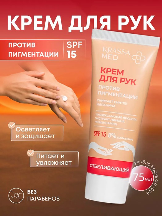 Для ежедневного ухода и отбеливания кожи рук. Крем с высокоактивными отбеливающими компонентами воздействует на процесс синтеза меланина, борется с пигментацией и предупреждает появление новых пигментных пятен, выравнивает тон, придавая коже рук молодость и сияющий вид.