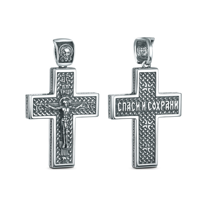 Крест из чернёного серебра - Рaспятие, Спаc Неpукотвоpный, Спаси и сохрани ПК-06
